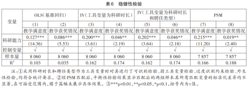 本研究采用更换工具变量和分析方法这两种方式来进行稳健性检验:其一,将高校教师的科研时长和聘任类型(是否属于“非升即走”序列的聘任类型)同时作为高校教师科研能力的工具变量;其二,采用倾向性得分匹配法(Propensity Score Matching,PSM),将科研能力高于均值的样本赋值为1(干预组),将科研能力低于均值的样本赋值为0(对照组),构建logit模型计算倾向得分值,采用最近邻匹配法进行匹配并回归。表6中列(5)和列(6)呈现了采用科研时长和聘任类型同时作为工具变量的回归结果,列(7)和列(8)呈现了采用PSM的回归结果,发现科研能力对教学质量依然存在显著的正向影响,说明本研究的研究结果较为稳健。