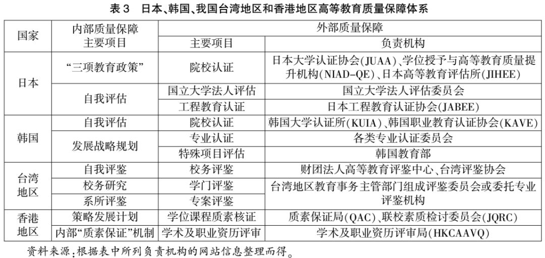 日本、韩国以及我国台湾地区和香港地区等亚洲国家和地区一直以来也十分重视高等教育质量保障工作。以自我评估、“三项教育政策”为核心的内部质量保障机制和以院校认证、国立大学法人评估以及工程教育认证为主的外部质量保障机制构成了当前日本高等教育质量保障体系。其中,院校认证根据学校类型的不同主要由3个专业评估机构独立负责。(见表3)21 世纪以来,韩国政府提出高等教育要从“注重规模”转向“注重质量”,其高等教育质量保障体系也逐渐构建起来,形成以自我评估、发展战略规划为主的内部质量保障机制和以院校认证、专业认证以及特定目的评估项目的外部质量保障机制。我国台湾地区自20世纪70年代开始构建起高等教育质量保障体系,目前已基本形成以自我评鉴、校务研究(Institutional Recearch,又译“院校研究”)为主的高校内部质量保障体系和以校务评鉴、系所评鉴、专案评鉴等为主的外部质量保障体系。我国香港地区高等教育质量保障体系主要包括以策略发展计划和内部“质素保证”机制为主的内部质量保障机制和以学位课程质素核证、学术及职业资历评审为主的外部质量保障体系。