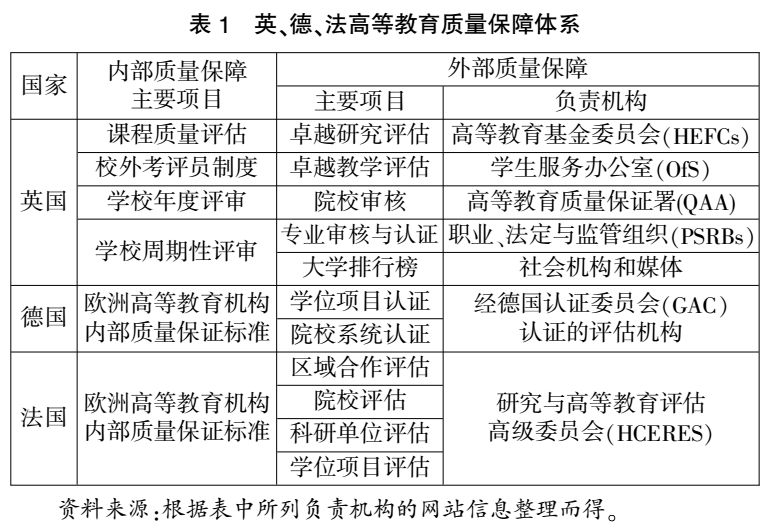 大学自治一直是英国引以为傲的传统,英国高校依靠一系列的自我调整与自我规范机制来确保其教育质量,主要包括课程质量评估、校外考评员制度、学校年度评审、学校周期性评审等。随着高等教育规模的扩张,英国政府和社会团体也参与到高等教育质量保障活动当中,卓越研究评估(REF)、卓越教学评估(TEF)、院校审核、专业审核与认证以及大学排行榜等构成了当前英国高等教育外部质量保障体系。德国和法国同属“欧洲高等教育区”,其质量保障主要遵守欧洲高等教育质量保障协会(ENQA)发布的《欧洲高等教育质量保障标准与指南(ESG)》。在ESG的指导下,德国开展了“学位项目认证”和“院校系统认证”,由经德国认证委员会(GAC)认可的质量保障机构实施。德国认证委员会(GAC)本身则由欧洲高等教育质量保障协会(ENQA)予以认证。在法国,研究与高等教育评估高级委员会(HCERES)是高等教育质量保障主要机构,开展多项全国性评估工作,如区域合作评估、院校评估、科研单位评估、学位项目评估等。(见表1)