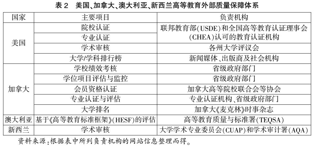 美国、加拿大、澳大利亚和新西兰的高校内部质量保障体系较为多元,鉴于篇幅有限,主要对其外部质量保障体系的基本架构进行梳理和呈现。(见表2)美国的外部质量保障主要由院校认证、专业认证、学术审核和大学/学科排行榜等项目组成,联邦教育部(USDE)、全国高等教育认证理事会(CHEA)不直接参与认证工作,而是交由其认可的认证组织具体负责。加拿大没有国家层面的教育质量保障机构,其高等教育质量保障体系主要由省级政府部门主导开展的学校绩效考核和学位项目评估与监控,高校联合会等专业协会开展的会员资格认证与质量保障以及社会媒体组织的大学排名等组成。在澳大利亚,高等教育质量与标准署(TEQSA)是一个独立的、非营利性机构,承担着高校资格注册、质量评估、专业及课程认证、咨询和建议、信息发布、培训等职能,并拥有注销不合格高等教育机构等方面的行政处罚权。新西兰最重要的高等教育外部质量保障机制主要是由各高校资助成立的大学学术专业委员会(CUAP)和学术审计署(AQA)负责监督与执行的学术审核,目前学术审核已开展到第6轮(2017—2023年)。